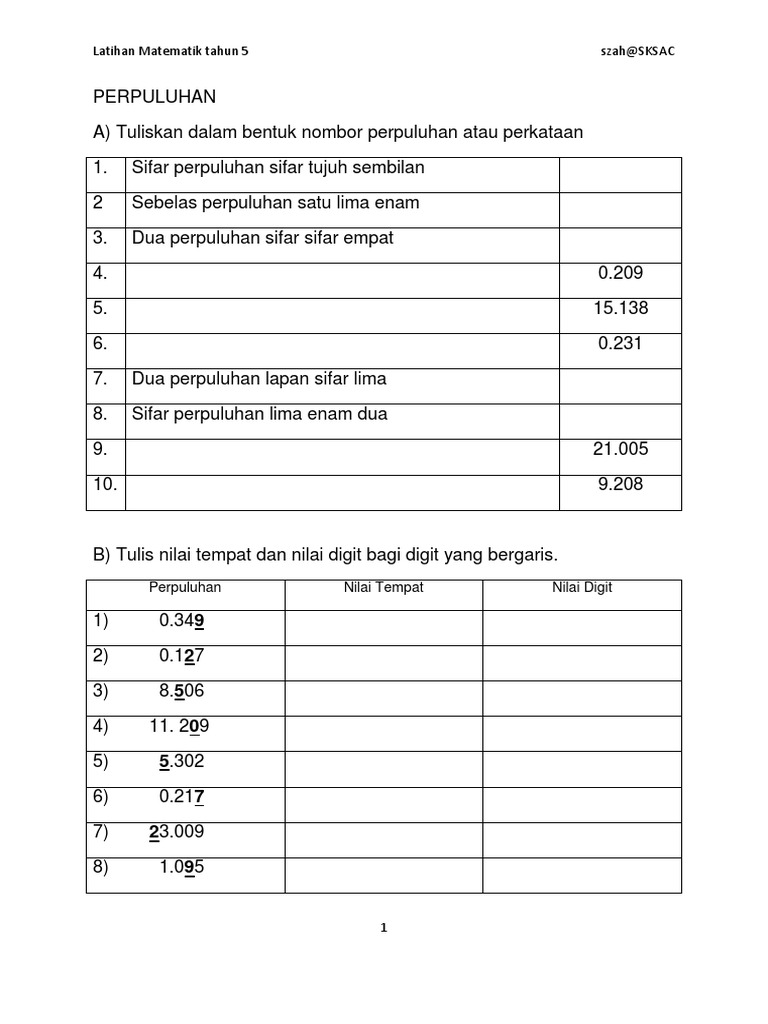 Latihan Matematik Tahun 5 Pecahan Peratus Perpuluhan Pdf